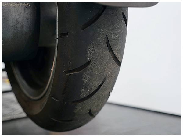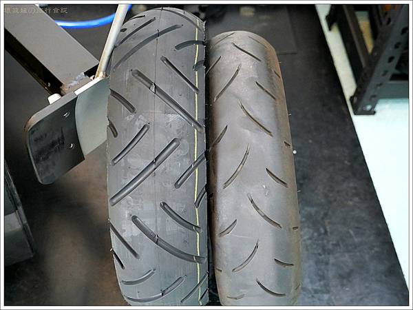 新舊輪胎擺一起,視覺上新輪胎有寬一點點,但溝槽深且寬很多! 其實我曾經騎Go share 滑倒過,就經過鐵軌的時候,完全無抓地力的雷殘了,所以深深的體會到右邊這顆光頭胎有多麼可怕。