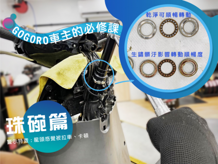 ▲ 珠碗(方向盤轉向軸承)生鏽髒污會造成車輛行進間有”拉車”, ”卡頓”現象,甚至有時轉彎時要費點力才推的過去,就有可能是輪胎沒氣或是珠碗磨損。
